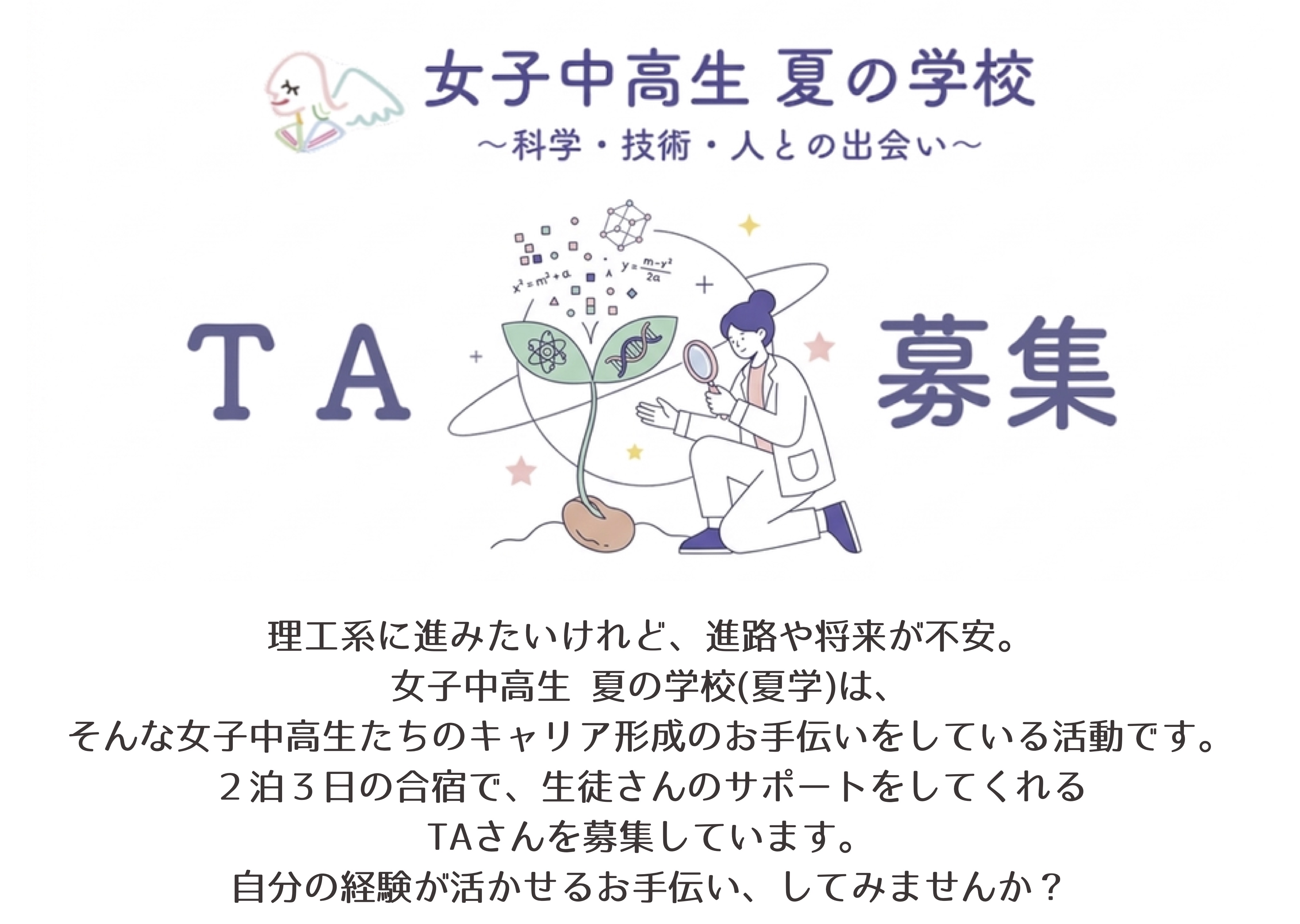 女子中高生夏の学校(夏学)に参加する中高生のサポートをする「学生 TA 」を募集します!